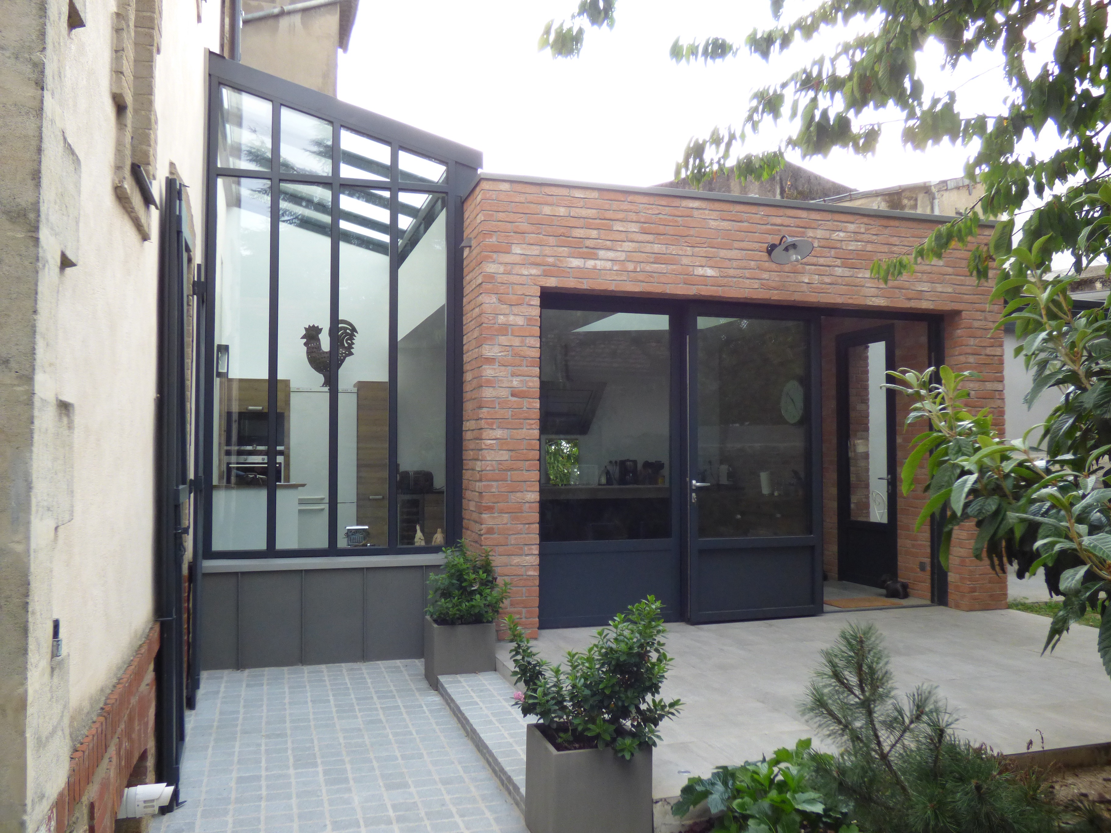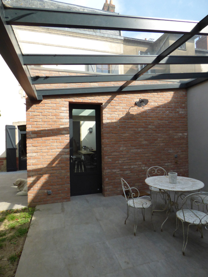 La brique rouge utilisée en parement s’harmonise avec les modénatures de la maison d’origine. La jonction entre les deux bâtiments est réalisée en verrière, préservant ainsi la transparence et l’élégance du projet.